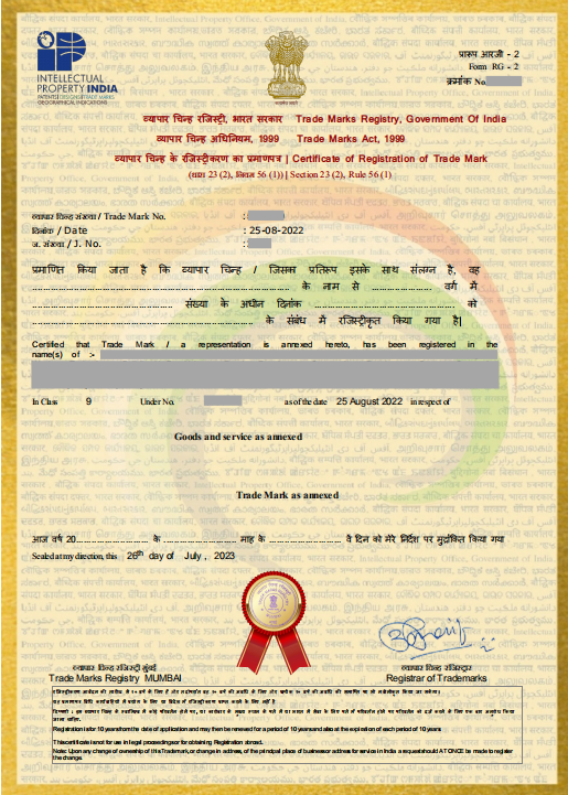 我司代理的深圳市**技术有限公司的“”商标的印度商标注册申请,于2022年08月25日提交注册申请,该商标于2023年07月26日成功注册。