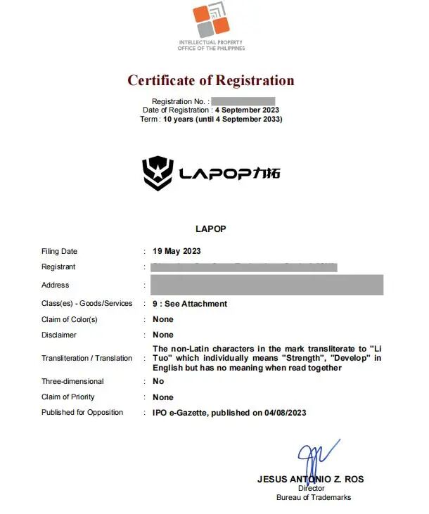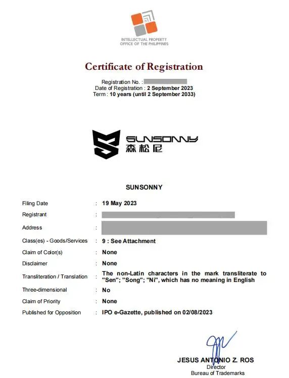 我司代理的深圳**科技有限公司的“”商标的菲律宾商标注册申请,于2023年05月19日提交注册申请,并于2023年09月04日成功注册。