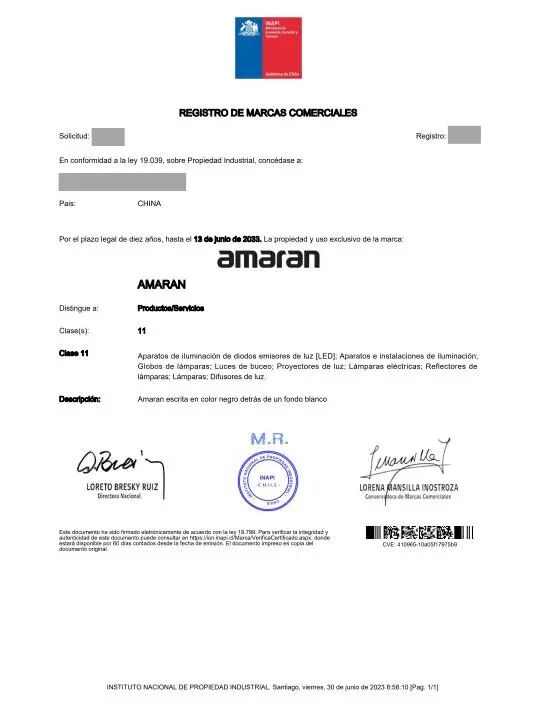 我司代理的深圳市**影像器材有限公司的“”商标的智利商标注册申请,于2022年04月05日提交注册申请,该商标于2023年06月13日成功注册。
