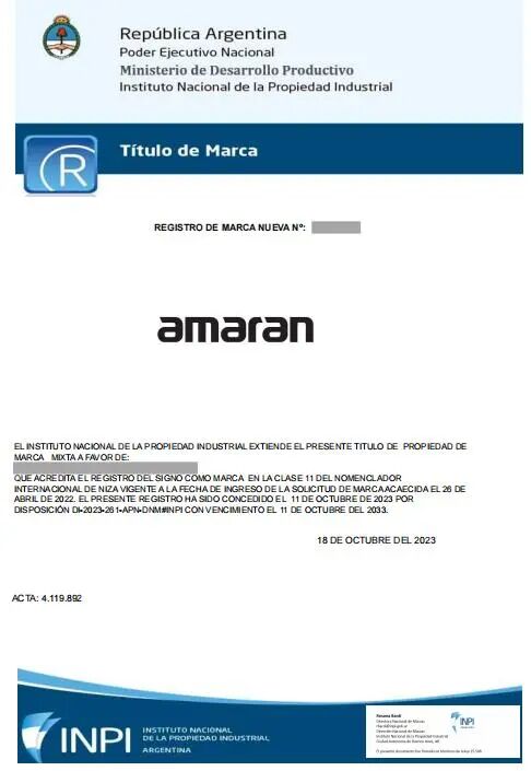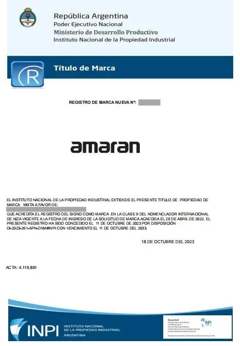 我司代理的深圳**科技股份有限公司的“”商标的阿根廷商标注册申请(第9类和11类),于2022年04月26日提交注册申请,该商标于2023年10月11日成功注册。
