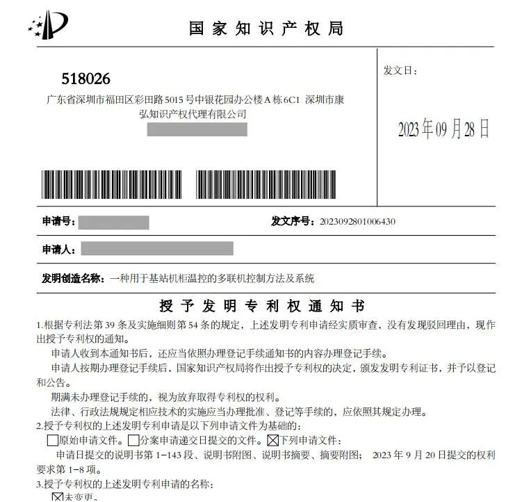 我司代理的安徽**科技有限公司的发明专利“一种用于基站机柜温控的多联机控制方法及系统”的申请,于2023年05月12日由国家知识产权局受理,2023年09月28日授予专利权。