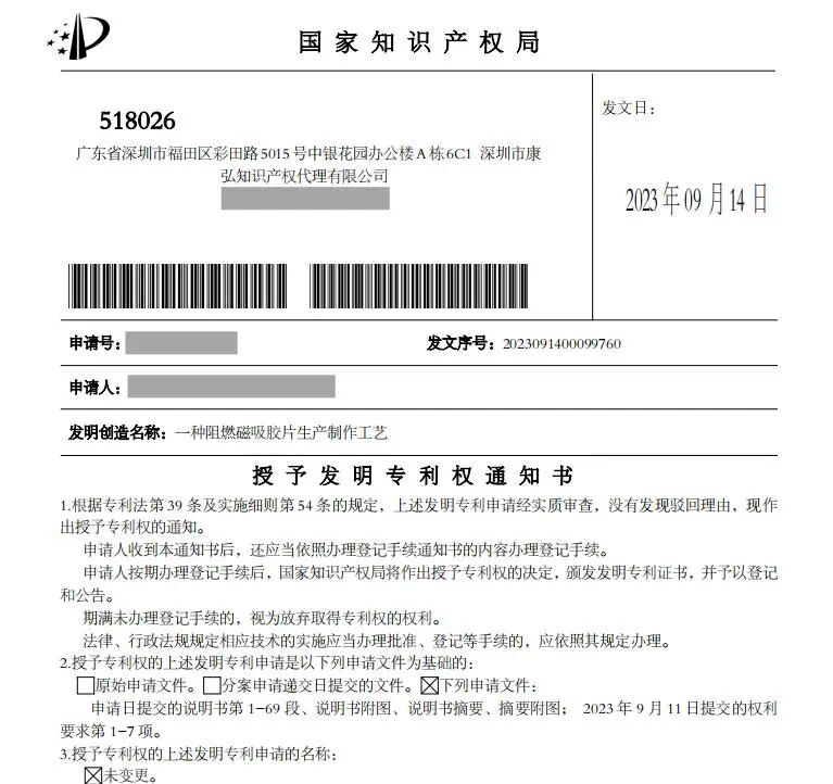 我司代理的广东**科技有限公司的发明专利“一种阻燃磁吸胶片生产制作工艺”的申请,于2023年05月26日由国家知识产权局受理,2023年09月14日授予专利权。