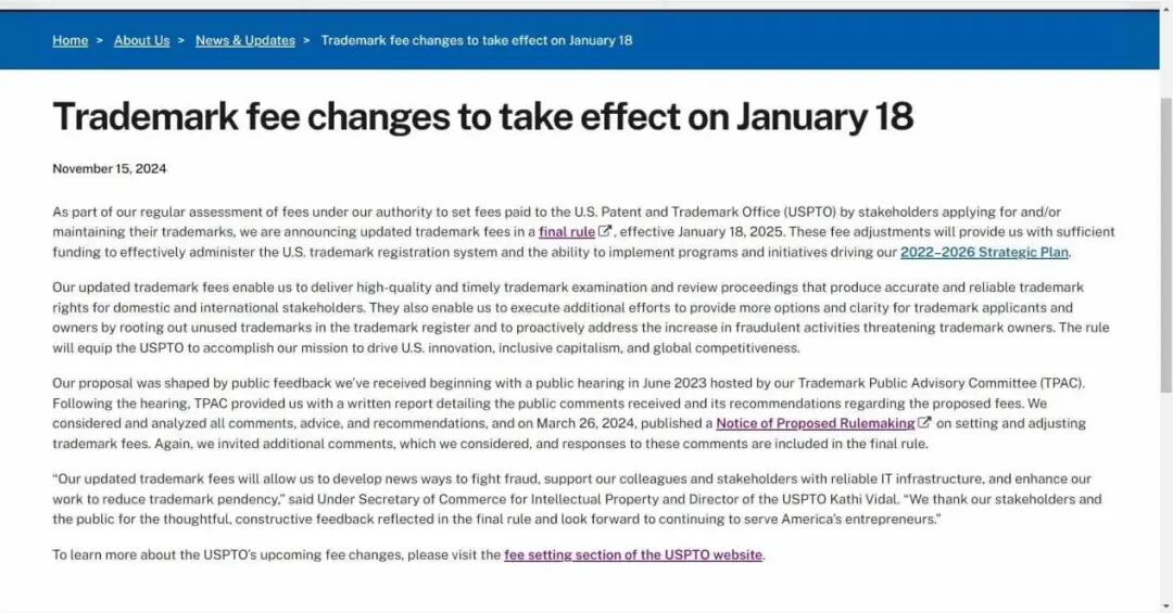 重要通知:美国商标官费上涨!2025年01月18日生效!